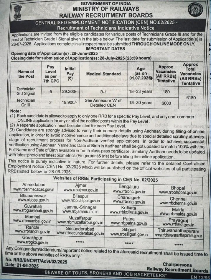 RRB Technician Recruitment 2025 : रेलवे भर्ती बोर्ड (RRB) ने 2025 के लिए टेक्नीशियन ग्रेड-I और ग्रेड-III के कुल 6238 पदों पर भर्ती का नोटिफिकेशन जारी कर दिया है। अगर आप रेलवे में सरकारी नौकरी का सपना देख रहे हैं, तो यह आपके लिए सुनहरा मौका है। ऑनलाइन आवेदन प्रक्रिया 28 जून 2025 से शुरू हो चुकी है और 07 अगस्त 2025 तक चलेगी। इस भर्ती में चयन कंप्यूटर बेस्ड टेस्ट (CBT), डॉक्यूमेंट वेरिफिकेशन और मेडिकल एग्जामिनेशन के जरिए होगा। यहां आप जानेंगे आवेदन प्रक्रिया, योग्यता, चयन प्रक्रिया, फीस, जोन-वाइज वैकेंसी और अन्य जरूरी जानकारी।